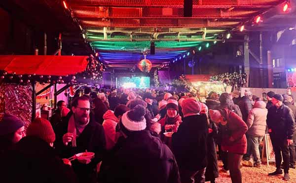 Grijs weer buiten maar gezellig in Christmas Avenue Berlin.